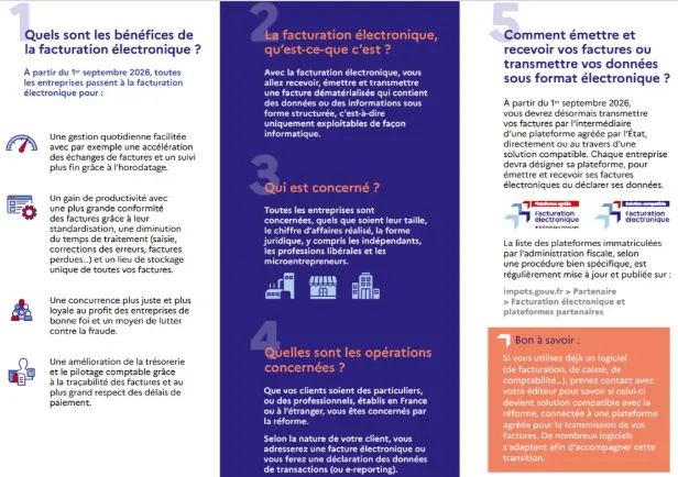 Toutes les entreprises, quelle que soit leur taille, sont concernées par la réforme dès le 1er septembre 2026, car elles doivent toutes être en capacité de recevoir des factures électroniques à compter de cette date (par exemple de leurs fournisseurs d’énergie, d’accès téléphone ou internet). En effet, les grandes entreprises et les entreprises de taille intermédiaire devront émettre l’intégralité de leurs factures au format électronique à cette date.